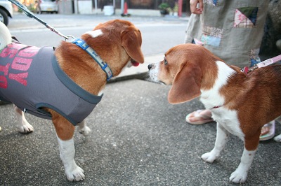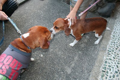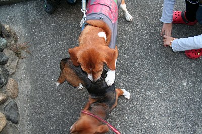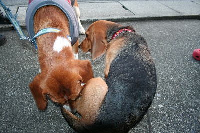 しばらくは大人しくニオイをかぎあっていたがずっと尻尾を巻