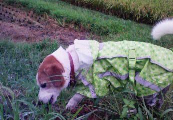 今朝は小雨だったのでカッパ着用のワンコたち。
