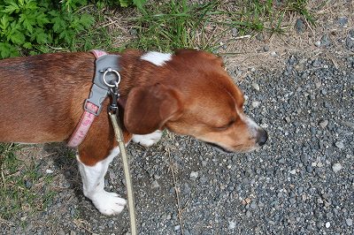 いた2頭引きリードだったが、ひまわりは引っ張られると座って