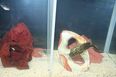仕切りの左側のフグさんはうちに来て2年ちょっと、右のデカフグさんは5