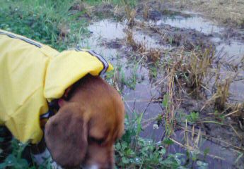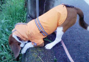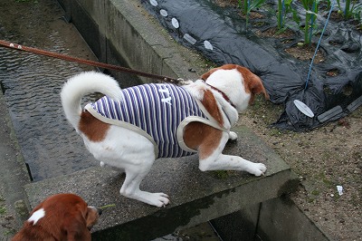 行く気満々で外に出るのでカッパを着せて第一便出発。