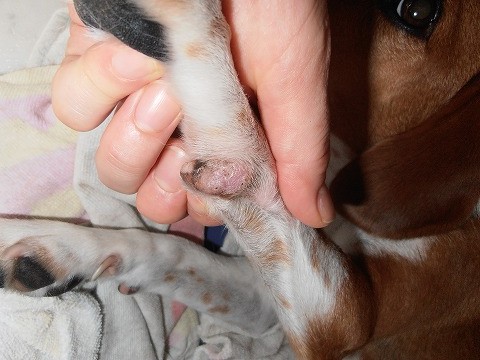 右に比べて肉球が2倍くらいの大きさになってるので治療は継続