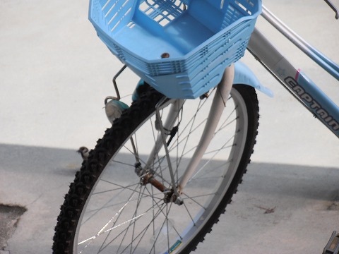自転車のタイヤの脇でえさをくわえているお母さんがわかりますか?