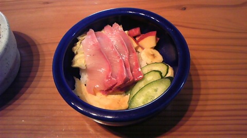 お誕生日ケーキをおやつにもらい、ブリのお刺身の