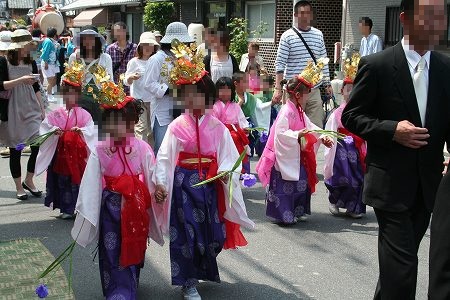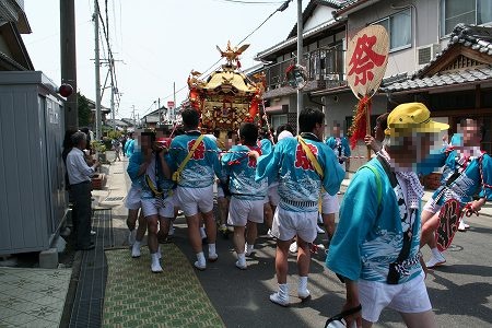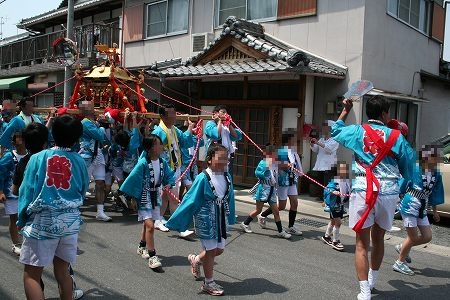 男性と子供はみこしをかつぎ、地域の役についているものは