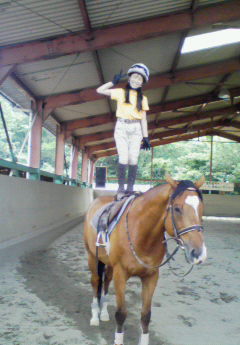 明日からお天気が悪いみたいなのでそれはそれで 気が滅入ります さすがのフロスティもこの暑さに ぐったりだったようです 暑いと水分補給が大切ですが、私は水が嫌いです。日本の水 も外国の水も一様に好きじゃないんです。でも水分補給には やはり水が一番で仕方がないので発泡水を飲んでいます。 水に炭酸が入っているだけで俄然美味しく感じてしまうのですが お水好きな人は大抵『まずそう』と言います。 炭酸が好きかと言えばすごく好きなわけじゃないんですけど 結構好きというレベルです。 あんまり発泡水好きな人って聞かないけど変わってるのかな? 今日のおまけ 馬の上に立つ娘 これ娘がすごいんじゃなくてこんなことにも動じない馬がすごい!